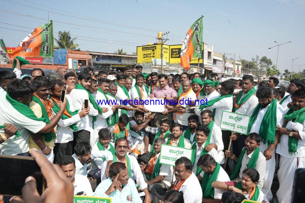ರಾಣೆಬೇನ್ನೂರ: ರೈತರ ಬೆಳೆಗಳಿಗೆ ಬೆಂಬಲ ಬೆಲೆ. ಬೆಳಹಾನಿ ಪರಿಹಾರವನ್ನು ರೈತರಿಗೆ ನೀಡುವಲ್ಲಿ ರಾಜ್ಯ ಕಾಂಗ್ರೆಸ್ ಸರ್ಕಾರದ ಕ್ರಮ ಖಂಡಿಸಿ ಬಿಜೆಪಿ, ಜೆಡಿಎಸ್ ಪಕ್ಷ ಹಾಗೂ ರೈತರು ನಗರದಲ್ಲಿ ಸೋಮವಾರ ಬೃಹತ್ ಪ್ರತಿಭಟನೆ ನಡೆಸಿದರು.